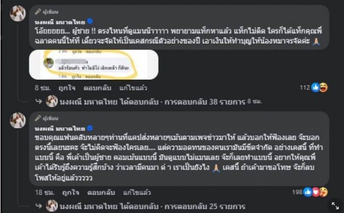 ‘ขอบคุณแฟนคลับหลายๆท่านที่แคปส่งหลายๆเม้นตามเพจข่าวมาให้ แล้วบอกให้ฟ้องเลย จ๊ะบอกตรงนี้เลยนะคะ จ๊ะไม่คิดจะฟ้องใครเลย…. แต่ความอดทนของคนเรามันมีขีดจำกัด อย่างเคสนี้ ที่ทำแบบนี้ คือ พี่เค้าเป็นผู้ชาย คอมเม้นแบบนี้ มันดูแบบไม่แมนเลย จ๊ะก็เลยทำแบบนี้ อยากให้คุณพี่ เค้าได้รับรู้ถึงความรู้สึกบ้าง ว่าเวลามีคนมา ด่ า เราเป็นยังไง เคสนี้ ถ้าเค้ามาขอโทษ จ๊ะก็ลบโพสให้อยู่แล้ววววว’