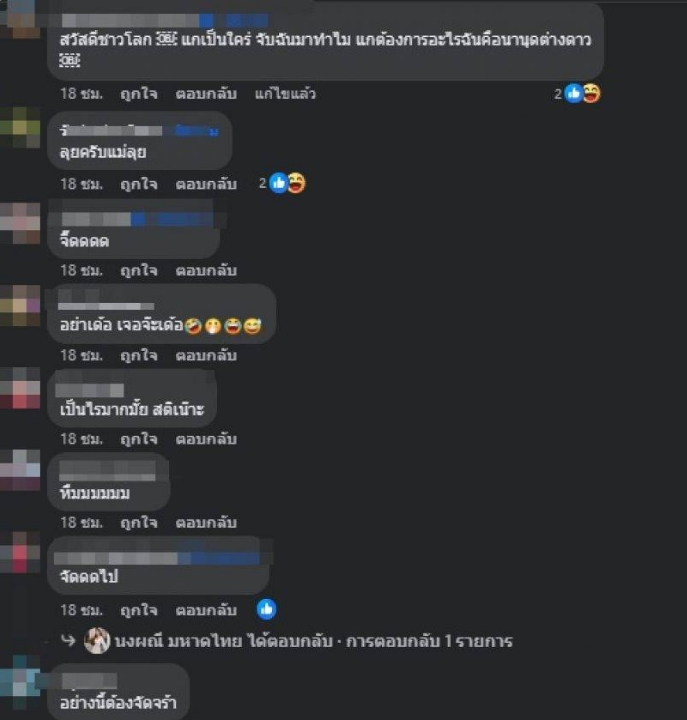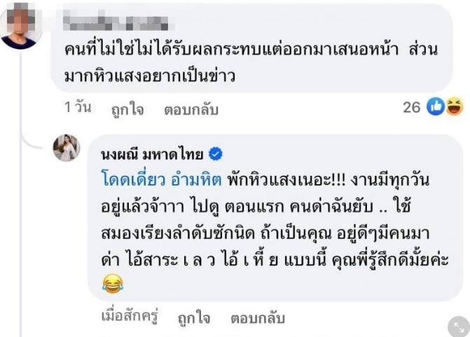 สาวจ๊ะก็ได้คอมเมนต์ตอกกลับ ‘พักหิวแสงเนอะ!!! งานมีทุกวันอยู่แล้วจ้าาา ไปดู ตอนแรก คนด่าฉันยับ .. ใช้สมองเรียงลำดับซักนิด ถ้าเป็นคุณ อยู่ดีๆมีคนมาด่า ไอ้สาระ เ ล ว ไอ้ เ … แบบนี้ คุณพี่รู้สึกดีมั้ยคะ’
