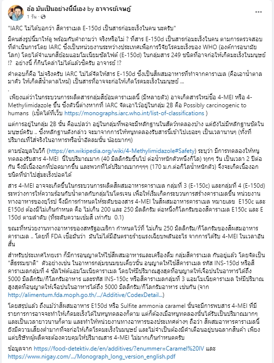 อ.เจษฎา กล่าวว่า เรื่องราวดังกล่าวไม่เป็นความจริง IARC ไม่ได้จัดให้สาร E-150d ซึ่งเป็นสีผสมอาหารที่ทำจากคาราเมล (คือเอาน้ำตาลมาคั่ว ให้เกิดสีน้ำตาลไหม้) เป็นสารที่อาจจะก่อให้เกิดโรคมะเร็งในมนุษย์