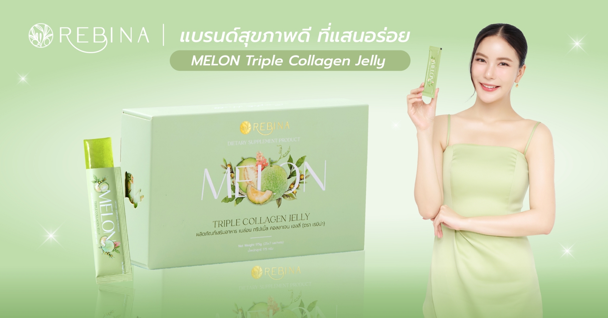 Melon Triple Collagen Jelly Dietary Supplement Product (Rebina Brand) ประกอบไปด้วยคอลลาเจน 3 สายพันธุ์ และยังมีสารสกัดจากธรรมชาติแท้ ๆ ที่มีประโยชน์มากมาย ช่วยในเรื่องการควบคุมน้ำหนักและดีต่อสุขภาพผิว นับว่าเป็นคอลลาเจนที่พร้อมเป็นทางเลือกสำหรับคนที่กำลังต้องการควบคุมน้ำหนักและดูแลรูปร่างทุกคน คอลลาเจน เจลลี่ รูปแบบซอง ที่คัดสรรส่วนผสมหลักจากธรรมชาติ จึงปลอดภัยทานง่าย ทานแล้วสดชื่นได้ประโยชน์ต่อร่างกาย อุดมไปด้วยสารอาหารและวิตามินมากมาย แถมยังรสชาติดีมีความอร่อยอีกด้วย