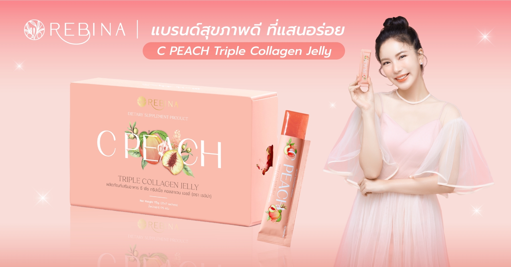 C Peach Triple Collagen Jelly Dietary Supplement Product (Rebina Brand) ผลิตภัณฑ์เสริมอาหารคอลลาเจนรูปแบบซอง ที่มีส่วนผสมจากธรรมชาติ อร่อยรสชาติดี รับประทานง่าย มีส่วนประกอบหลักเป็นคอลลาเจนถึง 3 สายพันธุ์ และยังอุดมไปด้วยสารสกัดจากธรรมชาติอันทรงคุณค่านานาชนิด ทั้งลูกพีชและผลไม้ตระกูลเบอร์รีซึ่งเป็นประโยชน์ต่อร่างกายและดีต่อสุขภาพผิวในหลาย ๆ ด้าน ได้ประโยชน์ต่อร่างกาย พกพาไปทานได้ทุกที่ และอุดมไปด้วยคุณค่าที่อัดแน่นในทุกซองมีส่วนช่วยในการบำรุงผิวให้ขาวกระจ่างใส เรียบเนียน และมีความยืดหยุ่น ลดเลือนจุดด่างดำ ฝ้า กระ รอยแดง และปัญหาเรื่องผิวคล้ำเสีย ชะลอความเสื่อมของเซลล์ ชะลอการเกิดริ้วรอยและปัญหาผิวแห้งกร้าน และช่วยให้ผิวดูอ่อนกว่าวัย