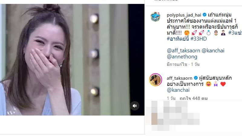 โดยในรายการหลังจากที่ “หนุ่ม กรรชัย” ลั่นไปแบบนั้น ก็ทำเอา “แอฟ ทักษอร” ถึงกับหัวเราะ และเขินแรงมาก พร้อมบอกว่า “โอเค ตอนนี้เรามีเรามีเป้าหมายละ” และยังได้เข้าไปคอมเมนต์ใต้โพสต์ด้วยว่า “ผู้สนับสนุนหลักอย่างเป็นทางการ” ท่ามกลางคอมเมนต์ทั้งแซวทั้งเชียร์ให้รีบแต่งเพียบ