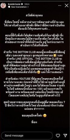 “สวัสดีค่ะทุกคน ซี่เขียน โพสต์นี้ หลังจากผ่านการคิดมาอย่างถี่ถ้วน และให้เวลากับตัวเองมาซักพัก ซี่คิดว่าซี่มีความจำเป็นที่จะต้องแจ้งให้ทุกคนทราบค่ะ.. ตอนนี้ซี่กับพี่เค้กได้ยุติความสัมพันธ์กันมาซักพัก ซึ่งปัจจุบันเราสองคนไม่มีความเกี่ยวข้องใด ๆ ทั้งสิ้น ในส่วนของภาระหน้าที่ที่ยังมีร่วมกัน อยู่ในกระบวนการดำเนินการให้เสร็จสิ้นค่ะ