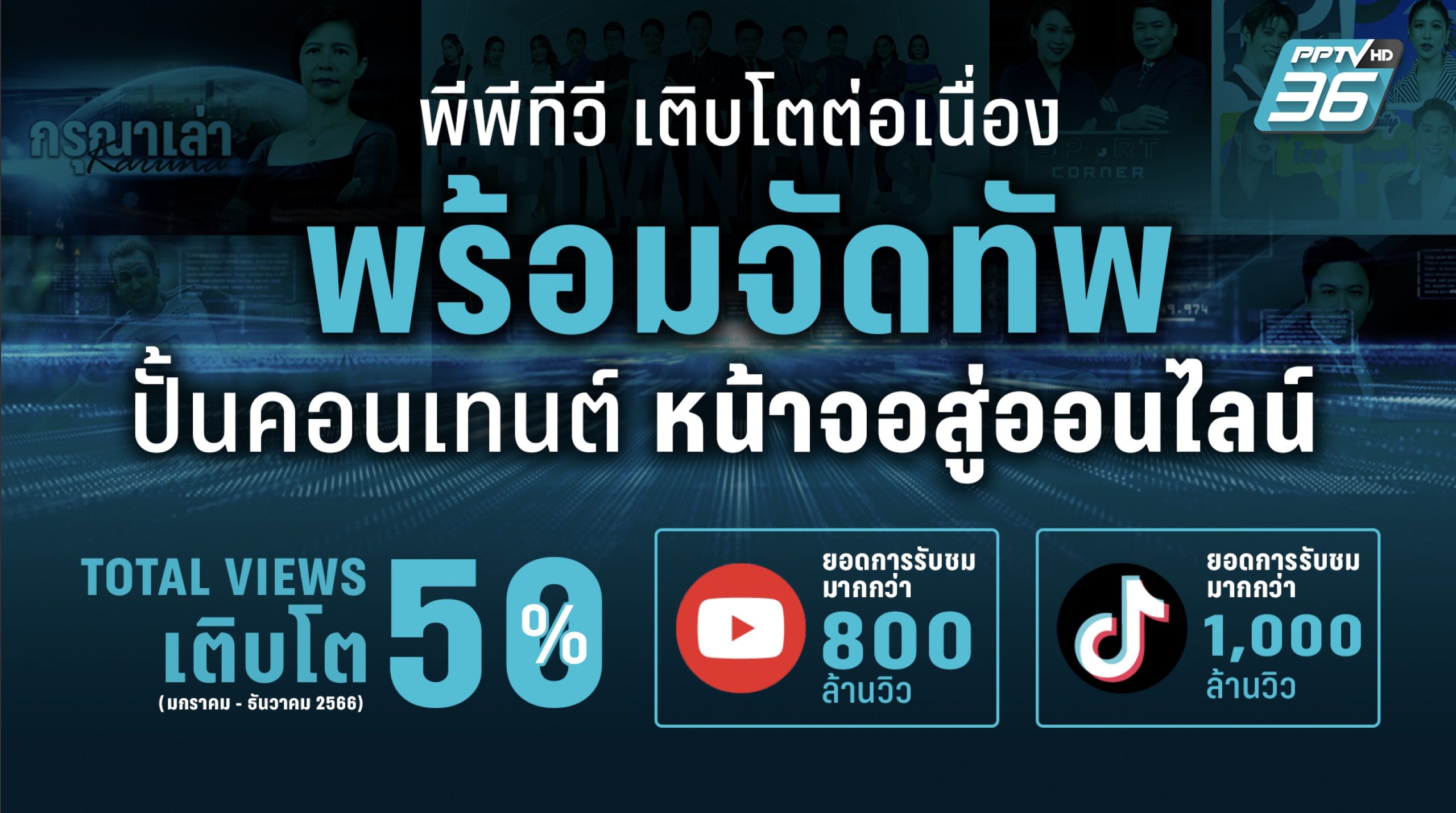 ปัจจุบันแพลตฟอร์มออนไลน์ พีพีทีวี เมื่อเทียบกับปีที่ผ่านมามีอัตราเติบโตสูงถึง 50% โดย YouTube ช่อง PPTV HD 36 มียอดผู้ติดตามถึง 6.51 ล้านคน และยังได้รับความนิยมอย่างต่อเนื่อง ซึ่งมียอดวิว (Views) สะสมตลอดปีทะลุถึง 800 ล้านวิว นอกจากนี้ การเข้าถึงคอนเทนต์บนแพลตฟอร์ม TikTok : PPTVHD36 ในช่วงเดือนมกราคมถึงพฤศจิกายน ปี 2566 มียอดวิวสะสมสูงทะลุ 1,000 ล้านวิวไปเรียบร้อยแล้ว นี่จึงเป็นการยืนยันได้ว่าหากเกิดเหตุการณ์สำคัญเกิดขึ้นทั้งในประเทศและต่างประเทศ ผู้ชมจำนวนมากเลือกที่จะติดตามข่าวสารจากพีพีทีวี ซึ่งติดอันดับเป็น Top of mind ในกลุ่มแฟนข่าว