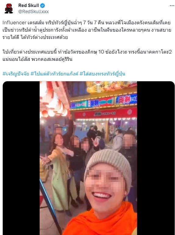 ขณะที่แฟนเพจระบุข้อความว่า “Influencer เดรสส้ม ทริปทัวร์ญี่ปุ่นฉ่ำ ๆ 7 วัน 7 คืน หลวงพี่โจเมืองตรังคนเดิม ที่เคยเป็นข่าวทริปดำน้ำดูประการังทั้งผ้าเหลือง อาชีพในฝันของใครหลาย ๆ คน งานสบาย รายได้ดี ได้ทัวร์ต่างประเทศด้วย”