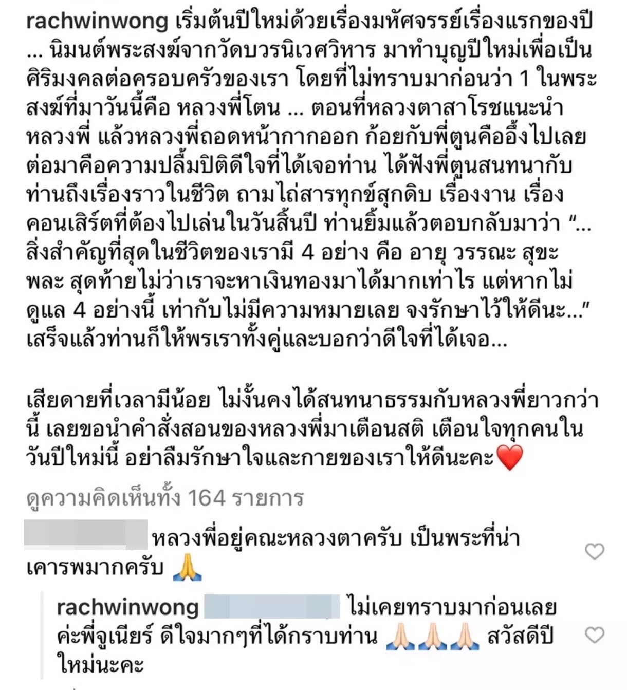 เสียดายที่เวลามีน้อย ไม่งั้นคงได้สนทนาธรรมกับหลวงพี่ยาวกว่านี้ เลยขอนำคำสั่งสอนของหลวงพี่มาเตือนสติ เตือนใจทุกคนในวันปีใหม่นี้ อย่าลืมรักษาใจและกายของเราให้ดีนะคะ”