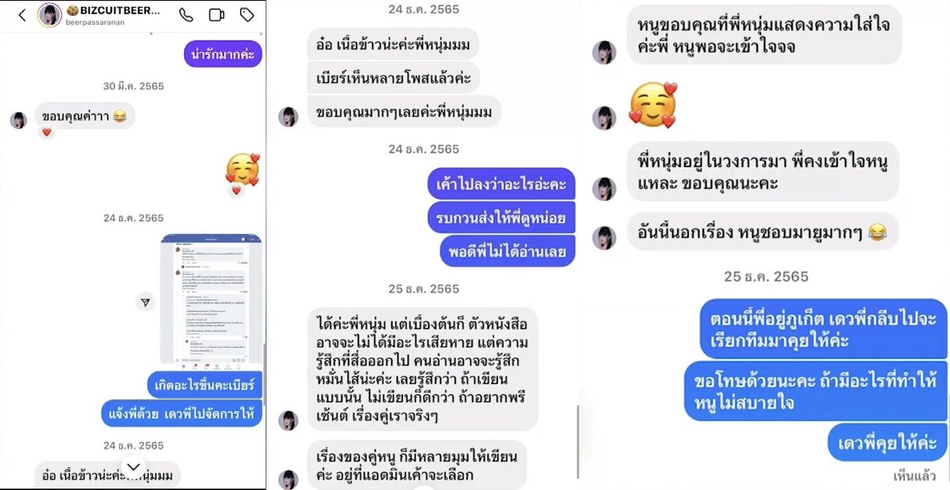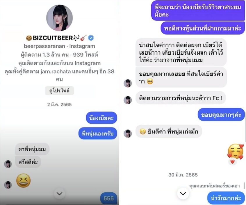 ยืนยันคุยกับเบียร์ด้วยเจตนาบริสุทธิ์ พร้อมเปิดข้อความแชทที่เคยคุยกับเบียร์ในไอจี ตั้งแต่วันที่ 2 มี.ค.65 โดยทักไปว่า “น้องเบียร์ค่ะ พี่หนุ่มเองครับ” ก่อนเบียร์ตอบมาว่า “ขาพี่หนุ่ม” จากนั้นผมได้ถามไปว่า “น้องเบียร์รับรีวิวยาสระผมมั้ยคะ พอดีหุ้นส่วนพี่ฝากถามมา”
