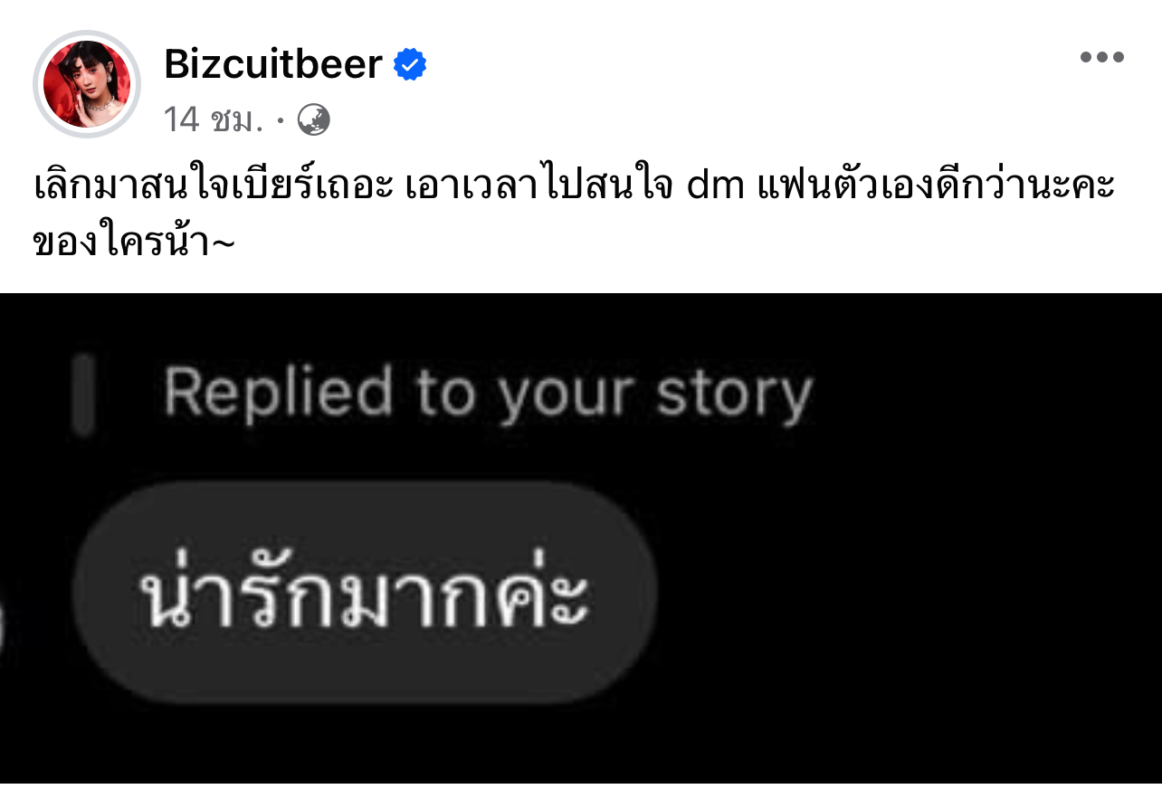 ต่อมา เบียร์ โพสต์ข้อความผ่านทางเฟซบุ๊ก Bizcuitbeer เป็น DM ปริศนาที่ได้พูดไว้ในไลฟ์ เป็นข้อความ “น่ารักมากค่ะ” พร้อมแคปชั่นว่า “เลิกมาสนใจเบียร์เถอะ เอาเวลาไปสนใจ dm แฟนตัวเองดีกว่านะคะ ของใครน้า~”