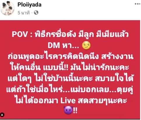 “พลอย อัยดา” ภรรยาพิธีกรดัง “กันต์ กันตถาวร” นั้นก็ไม่ขอทน หลังสามีโดนโยง เลยออกมาโพสต์ฟาด โดยเธอได้ระบุข้อความว่า “โยนมาซะ บ้านจะบึ้มมม!!! ทำเอาคนอื่นได้รับผลกระทบไปด้วย คนทักมาถามแต่เช้า ยันตอนนี้ นี่ตื่นมางงเลย…เอาจริงๆไม่ได้ตามข่าวน้อง และไม่ได้รู้จักน้องมาก่อน พอมาฟังก็งงๆ กับคำพูดน้องนะ…