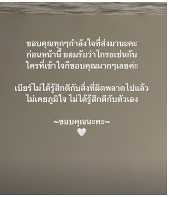 พร้อมทั้งยังได้โพสต์ข้อความขอบคุณทุกกำลังใจที่ส่งมา ก่อนหน้านี้ยอมรับว่าโกรธเช่นกัน ใครที่เข้าใจก็ขอบคุณมากๆ เบียร์ไม่ได้รู้สึกดีกับสิ่งที่ผิดพลาดไปแล้ว ไม่เคยภูมิใจ ไม่ได้รู้สึกดีกับตัวเอง ขอบคุณนะคะ