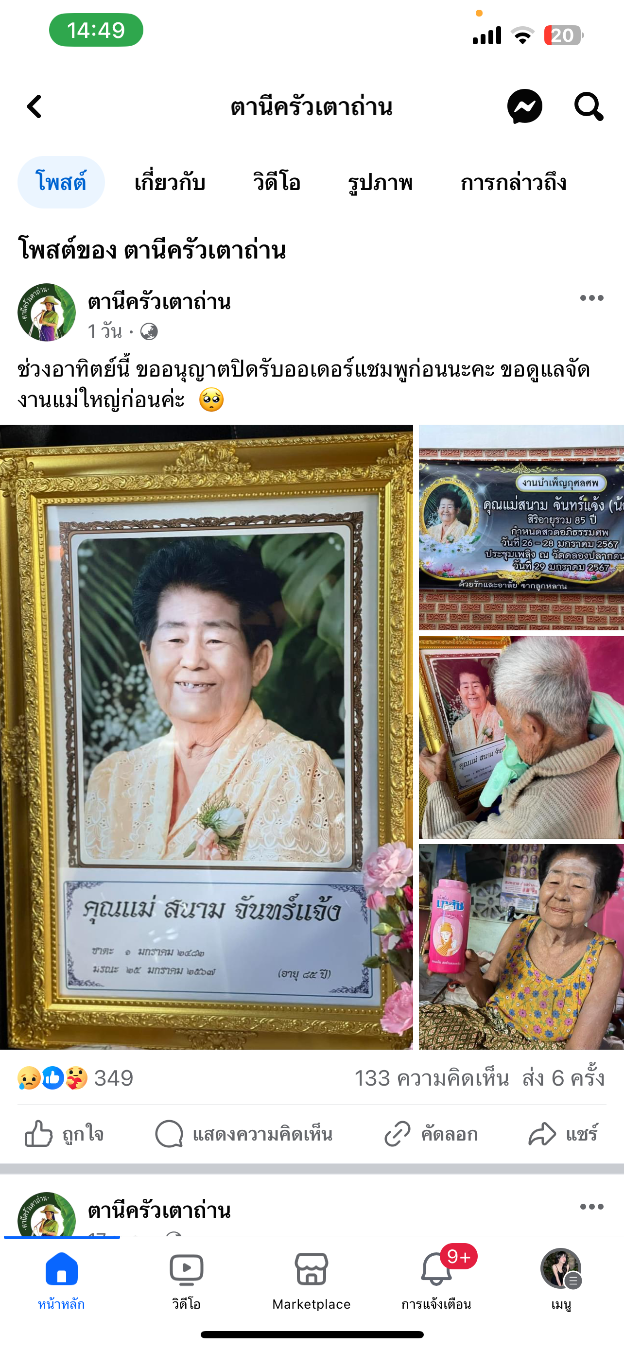 ขณะที่ทางเพจเฟซบุ๊ก ตานีครัวเตาถ่าน ก็ได้โพสต์ภาพ พร้อมข้อความระบุว่า ช่วงอาทิตย์นี้ ขออนุญาตปิดรับออเดอร์แชมพูก่อนนะคะ ขอดูแลจัดงานแม่ใหญ่ก่อนค่ะ
