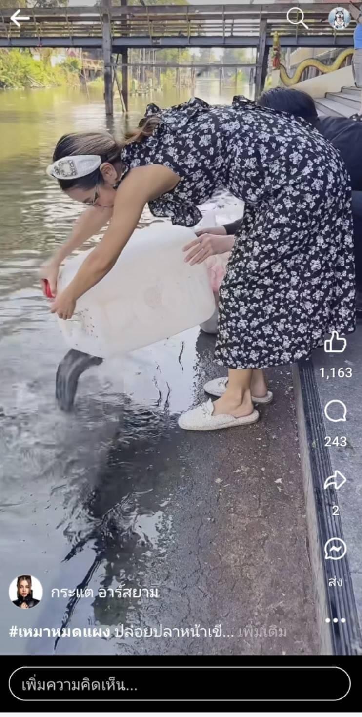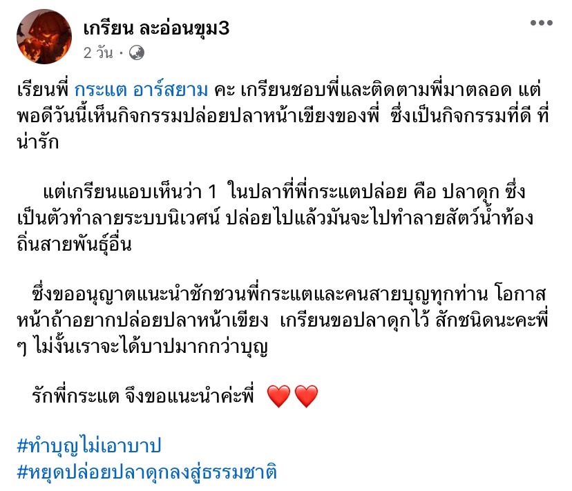 “เรียนพี่ กระแต อาร์สยาม คะ เกรียนชอบพี่และติดตามพี่มาตลอด แต่พอดีวันนี้เห็นกิจกรรมปล่อยปลาหน้าเขียงของพี่ ซึ่งเป็นกิจกรรมที่ดี ที่น่ารัก