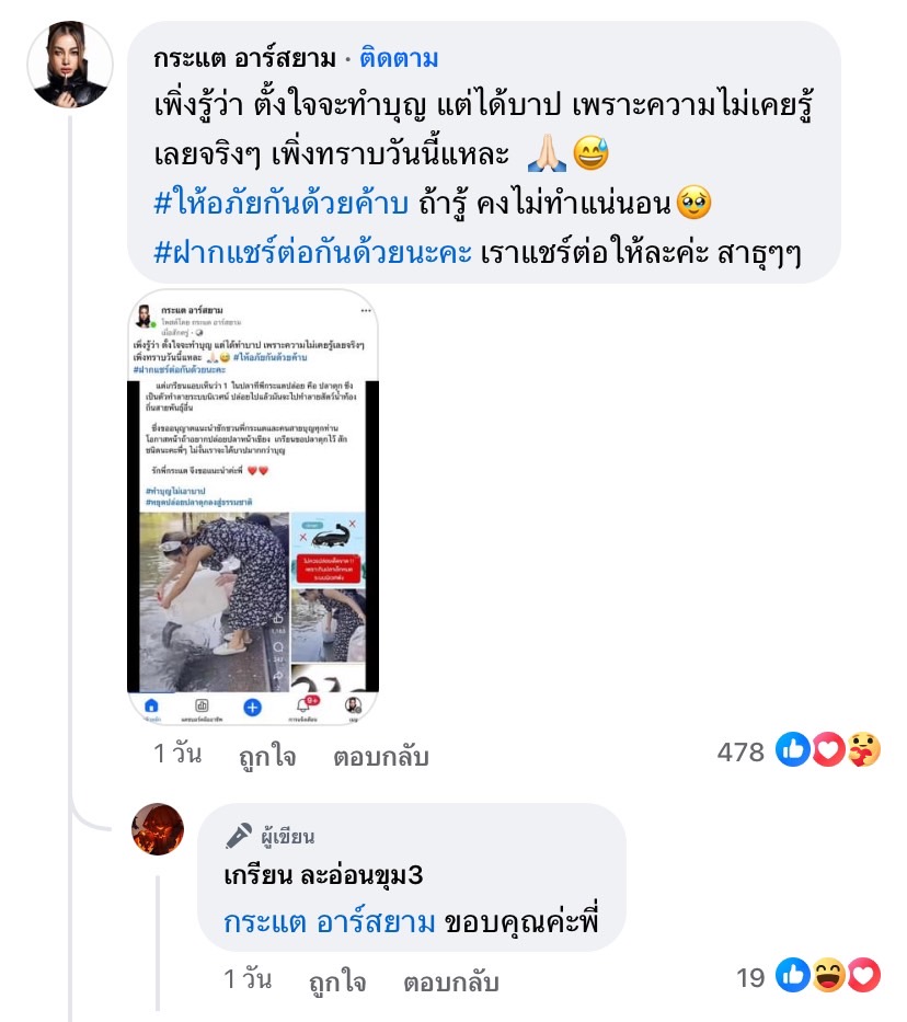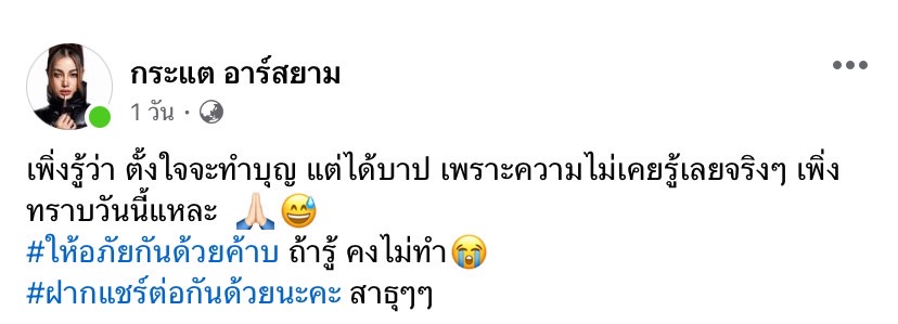 “เพิ่งรู้ว่า ตั้งใจจะทำบุญ แต่ได้บาป เพราะความไม่เคยรู้เลยจริง ๆ เพิ่งทราบวันนี้แหละ #ให้อภัยกันด้วยค้าบ ถ้ารู้ คงไม่ทำ#ฝากแชร์ต่อกันด้วยนะคะ”