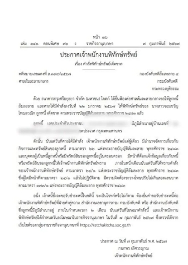 เว็บไซต์ราชกิจจานุเบกษา เผยแพร่ประกาศเจ้าพนักงานพิทักษ์ทรัพย์  เรื่อง คำสั่งพิทักษ์ทรัพย์เด็ดขาด ในคดีหมายเลขแดงที่ ล.399/2567 ศาลล้มละลายกลาง กองบังคับคดีล้มละลาย 4 กรมบังคับคดี กระทรวงยุติธรรม โดยประกาศฉบับดังกล่าวระบุว่า