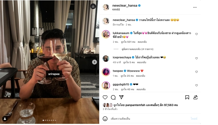 ล่าสุดก็ถึงคิวของ นิวเคลียร์ หรรษา ที่งานนี้ได้โพสต์รูปหนุ่มนอกวงการ ที่แม้จะไม่ได้เปิดหน้าอีกฝ่ายแบบเต็มๆ เพราะมีแก้วไวน์มาบังใบหน้าบางส่วนเอาไว้ และเจ้าตัวก็เขียนแคปชั่นหวานๆ ว่า “วาเลนไทน์นี้เราไม่เหงาและ”