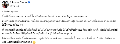 โดยข้อความที่ มิ้นท์ I Roam Alone ประกาศผ่านเพจตัวเอง เกี่ยวกับเรื่องแยกทางแฟนหนุ่ม มีข้อความว่า