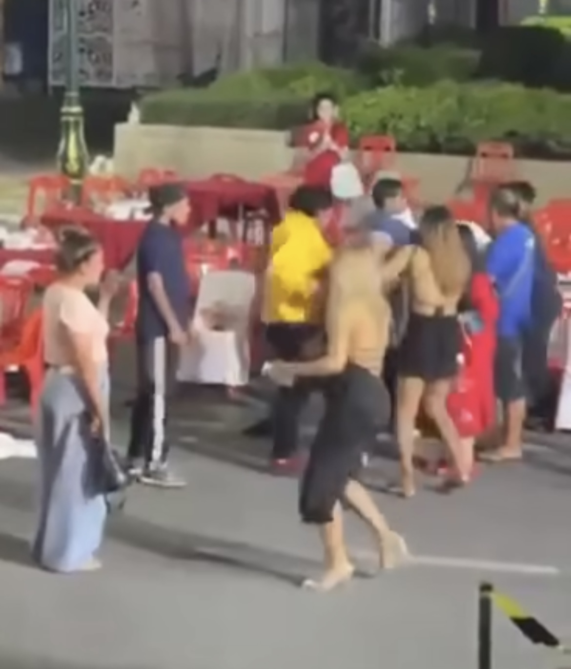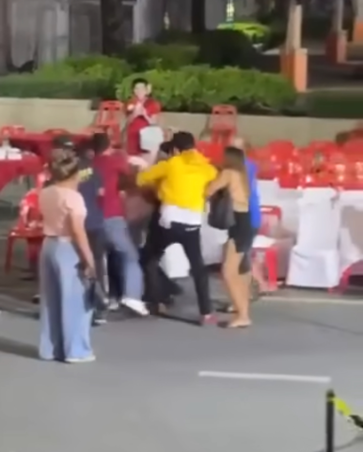 – ลูกน้องก็ตบเลยทันที ตรงนั้น และทางพิธีกรก็ลากเหล็กกั้นทางมาเพื่อจะตีด้วย แต่ด้วยความวุ่นวาย เขาทิ้งเหล็กและเปลี่ยนมาใช้เก้าอี้ตีแทน ตรงหน้าผาก แขน หลัง ตามรูป พี่เลี้ยงก็ช่วยกันห้าม แต่ทีมเขาเยอะมาก ผู้ชายเกือบสิบคนตามในคลิป