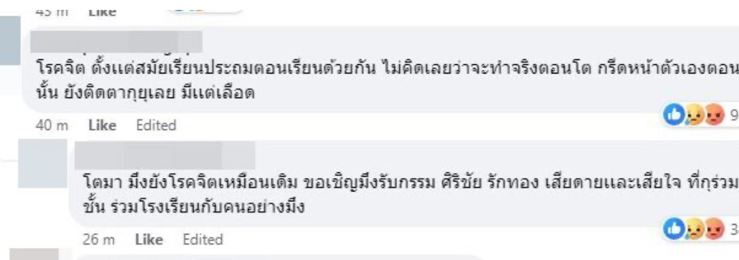 โดยยังคอมเมนต์อีกว่า “โตมา ยังโรคจิตเหมือนเดิม ขอเชิญรับกรรม ศิริชัย เสียหายและเสียใจที่ร่วมชั้น ร่วมโรงเรียนกับคนอย่างมึง”