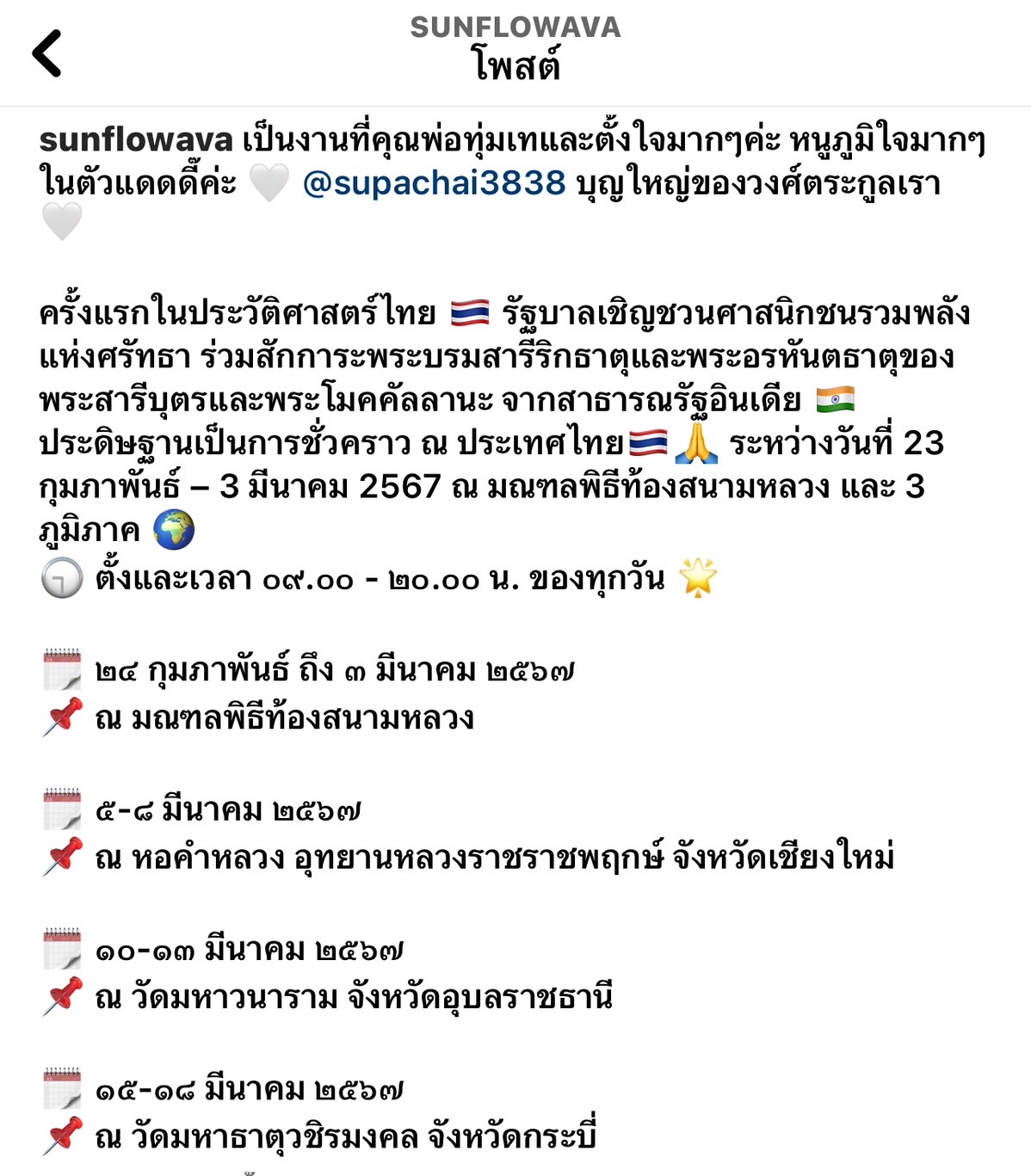 “เป็นงานที่คุณพ่อทุ่มเทและตั้งใจมากๆค่ะ หนูภูมิใจมากๆในตัวแดดดี๊ค่ะ 🤍 @supachai3838 บุญใหญ่ของวงศ์ตระกูลเรา 🤍” ครั้งแรกในประวัติศาสตร์ไทย 🇹🇭 รัฐบาลเชิญชวนศาสนิกชนรวมพลังแห่งศรัทธา ร่วมสักการะพระบรมสารีริกธาตุและพระอรหันตธาตุของพระสารีบุตรและพระโมคคัลลานะ จากสาธารณรัฐอินเดีย 🇮🇳 ประดิษฐานเป็นการชั่วคราว ณ ประเทศไทย🇹🇭🙏 ระหว่างวันที่ 23 กุมภาพันธ์ – 3 มีนาคม 2567 ณ มณฑลพิธีท้องสนามหลวง และ 3 ภูมิภาค 🌍 https://www.instagram.com/reel/C3uycyGx4VE/?igsh=ZmtyZnVnMG9zNG5o