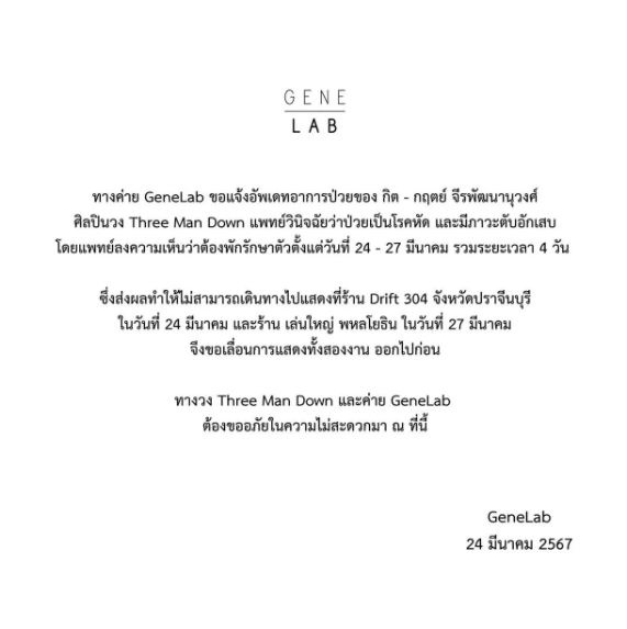 ทั้งนี้ต้นสังกัดได้แจ้งว่า “ทางค่าย GeneLab ขอแจ้งอัปเดตอาการป่วยของ กิต-กฤตย์ จีรพัฒนานุวงศ์ ศิลปินวง Three Man Down แพทย์วินิจฉัยว่าป่วยเป็นโรคหัด และมีภาวะตับอักเสบ โดยแพทย์ลงความเห็นว่าต้องพักรักษาตัวตั้งแต่วันที่ 24-27 มีนาคม รวมระยะเวลา 4 วัน”