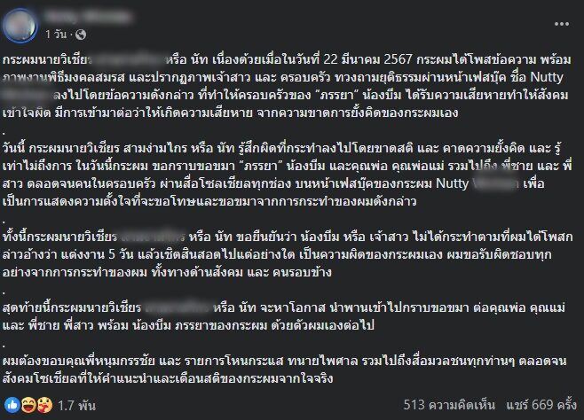 กระผมได้โพสต์ข้อความ พร้อมภาพงานพิธีมงคลสมรส และปรากฏภาพเจ้าสาว และ ครอบครัว ทวงถามยุติธรรมผ่านหน้าเฟซบุ๊ก ลงไปโดยข้อความดังกล่าว ที่ทำให้ครอบครัวของ “ภรรยา” น้องบีม ได้รับความเสียหายทำให้สังคมเข้าใจผิด มีการเข้ามาต่อว่าให้เกิดความเสียหาย จากความขาดการยั้งคิดของกระผมเอง