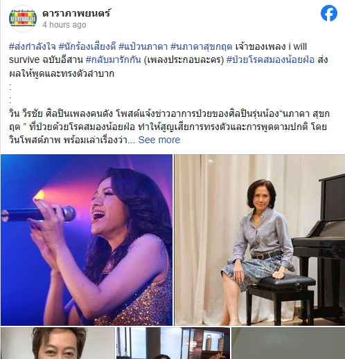 รายงานจากเฟซบุ๊กเพจ ดาราภาพยนตร์ เมื่อวันศุกร์ที่ 29 มีนาคม 2567 วิน วีรชัย ศิลปินเพลงคนดัง โพสต์แจ้งข่าวอาการป่วยของศิลปินรุ่นน้อง “นภาดา สุขกฤต” พี่ แป๋ว สายสุนีย์ หรือนภาดา สุขกฤต อดีตนักร้องดีเด่นแห่งประเทศไทย ปี2536 ของสยามกลการ บัณฑิตคณะโบราณคดี มหาวิทยาลัยศิลปากร เจ้าของเพลง i will survive ฉบับอีสาน ‘กลับมารักกัน’ (เพลงประกอบละคร) ที่ป่วยด้วยโรคสมองน้อยฝ่อ ทำให้สูญเสียการทรงตัวและการพูดตามปกติ