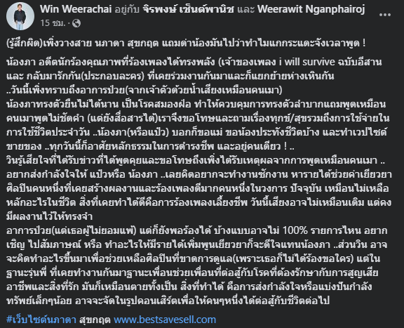 วินรู้เสียใจที่ได้รับข่าวที่ได้พูดคุยและขอโทษถึงเพิ่งได้รับเหตุผลจากการพูดเหมือนคนเมา .. อยากส่งกำลังใจให้ แป๋วหรือ น้องภา ..เลยคิดอยากจะทำงานซักงาน หารายได้ช่วยค่าเยียวยาศิลปินคนหนึ่งที่เคยสร้างผลงานและร้องเพลงดีมากคนหนึ่งในวงการ ปัจจุบัน เหมือนไม่เหลือหลักอะไรในชีวิต สิ่งที่เคยทำได้ดีคือการร้องเพลงเลี้ยงชีพ วันนี้เสียงอาจไม่เหมือนเดิม แต่คงมีผลงานไว้ให้ทรงจำ อาการป่วย(แต่เธอผู้ไม่ยอมแพ้) แต่ก็ยังพอร้องได้ บ้างแบบอาจไม่ 100% รายการไหน อยากเชิญ ไปสัมภาษณ์ หรือ ทำอะไรให้มีรายได้เพิ่มพูนเยียวยาก็จะดีใจแทนน้องภา ..ส่วนวิน อาจจะคิดทำอะไรขึ้นมาเพื่อช่วยเหลือศิลปินที่ขาดการดูแล(เพราะเธอก็ไม่ได้ร้องขอใคร) แต่ในฐานะรุ่นพี่ ที่เคยทำงานกันมาฐานะเพื่อนช่วยเพื่อนที่ต่อสู้กับโรคที่ต้องรักษากับการสูญเสียอาชีพและสิ่งที่รัก มันก็เหมือนตายทั้งเป็น สิ่งที่ทำได้ คือการส่งกำลังใจหรือแบ่งปันกำลังทรัพย์เล็กๆน้อย อาจจะจัดในรูปคอนเสิร์ตเพื่อให้คนๆหนึ่งได้ต่อสู้กับชีวิตต่อไป”