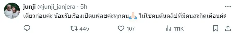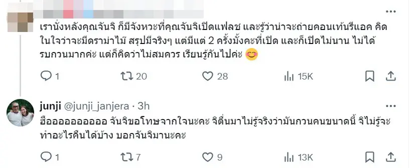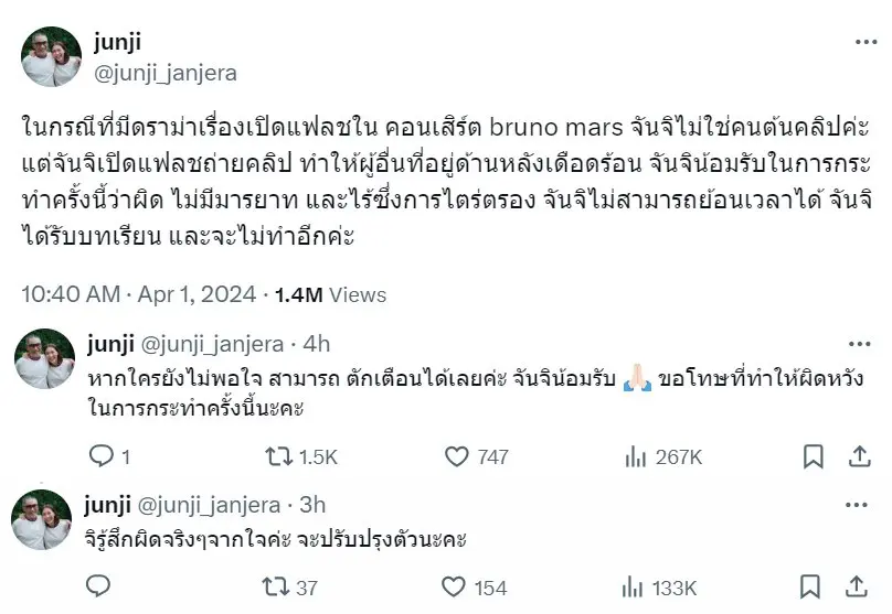 ขณะที่ดาราสาว จันจิ จันจิรา ที่ไปร่วมชมคอนเสิร์ต “BRUNO MARS LIVE IN BANGKOK” ก็ยืดอกรับว่าเป็นหนึ่งในคนที่เปิดแฟลชถ่ายคลิปในคอนเสิร์ต “บรูโน่ มาร์ส” เช่นกัน แต่ยืนยันไม่ใช่คนเดียวกับโพสต์ต้นเรื่อง ที่สะกิดบอกแต่ไม่หยุดถ่ายแน่นอน งานนี้เจ้าตัวออกมาโพสต์ขอโทษใน X แล้ว “
