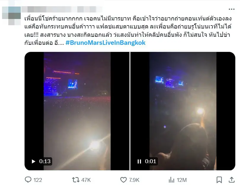 เรียกได้ว่าดราม่าสนั่นโซเชียลทันที เมื่อมีโพสต์ใน X (ทวิตเตอร์) “เพื่อนนี่โชคร้ายมากกกก เจอคนไม่มีมารยาท คือเข้าใจว่าอยากถ่ายคอนเทนต์ตัวเองลง แต่คือทันกระทบคนอื่นค้าาาา แฟลชแสบตาแบบสุด ละเพื่อนคือถ่ายบรูโน่บนเวทีไม่ได้เลย!!! สงสารนาง นางสะกิดบอกแล้ว ว่แสงมันทำให้คลิปคนอื่นพัง ก็ไม่สนใจ หันไปขำกับเพื่อนต่อ อี….#BrunoMarsLiveInBangkok”