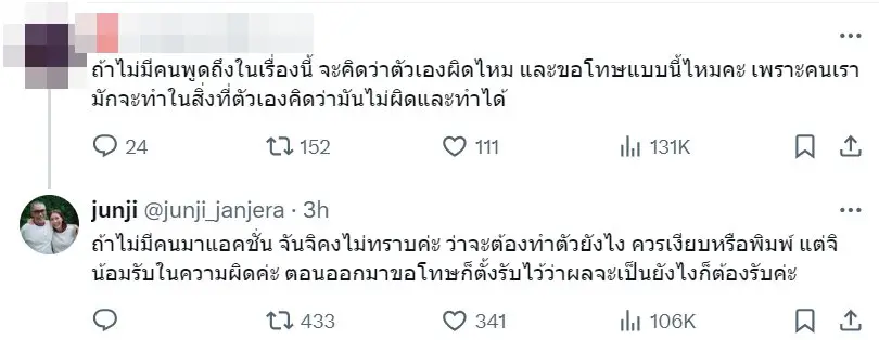 ล่าสุดช่วงดึกวันที่ 1 เม.ย. 2567 จันจิ ออกมาไลฟ์ในติ๊กตอก พร้อมขอโทษทั้งน้ำตา โดยเธอกล่าวว่า “เขาคงอาจจะเป็นครั้งเดียว ครั้งแรกและครั้งสุดท้ายในชีวิตของเขาที่จะได้ดูคอนเสิร์ตนั้น และจันจิก็เป็นหนึ่งในนั้นที่ไปทำลายบรรยากาศของเขา จิเลยน้อมรับทุกคำตักเตือน ฝากแล้วกันนะคะ อะไรที่จันจิทำเมื่อวาน ต้องบอกจริง ๆ ว่าเหมือนคนโง่ ไม่ได้ฉลาดทุกเรื่อง ต่อให้จันจิอายุ 30 แล้ว มันก็มีหลายเรื่องที่จันจิยังไม่ได้เรียนรู้ ถามว่าไม่คิดบ้างเหรอทำไมหน้าหนาจังเลย ทำไมยังกล้าเปิดแฟลช ต้องขอโทษจริง ๆ ที่เราถ่ายคลิป ความไม่อายของจันจิ มันจะไม่ได้รู้สึกว่าเราอายมาก แต่ถ้ารู้ว่ามันไปแยงตาคนอื่น จันจิจะโคตรอายเลยจริง ๆ มันไม่ฉลาดค่ะ จันจิไม่ฉลาด ต่อให้มีทุกคอนเราก็จะเก็บไว้เป็นบทเรียนค่ะ สงสารพี่คนนั้นเหมือนกันที่เขาสะกิดแล้วไม่หยุดถ่าย สงสารพี่ ๆ ข้างหลังเป็นผู้ชายหมดเลย จันจิก็รู้สึกว่าพี่ ๆ ผู้ชายข้างหลังเขาคงช่างเถอะ อีนี่มันอยากถ่ายก็ถ่าย เขาเป็นผู้ชายเขาคงไม่มานั่งว่าอะไรจันจิหรอก”
