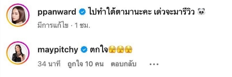 “ไปทำใต้ตามานะคะ เด่วจะมารีวิว” ทำเอาเพื่อนสาวอย่าง เมย์ พิชญ์นาฏ ที่เห็นรูปพลีชีพดังกล่าวของสาวเป้ยก็เข้ามาคอมเมนต์ว่า “ตกใจ”.
