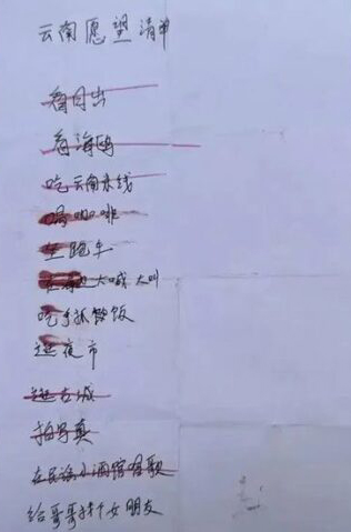 นอกจากนี้ ยังมีสิ่งที่เธออยากทำอีก คือ ชมพระอาทิตย์ขึ้น ชิมกาแฟยูนนาน นั่งรถสปอร์ต ร้องเพลงในผับ ถ่ายรูปตัวเอง ซึ่งเธอสามารถทำทุกสิ่งสำเร็จไปเมื่อเดือนพฤศจิกายนปีที่แล้ว แต่มีเพียงความปรารถนาสุดท้ายเท่านั้นที่ยังคงไม่สมหวัง นั่นคือ หาแฟนให้พี่ชายของเธอ