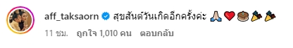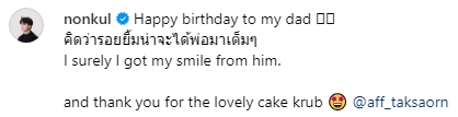 ซึ่งโมเมนต์นี้ นนกุล ได้เขียนแคปชั่นไว้ว่า “Happy birthday to my dad คิดว่ารอยยิ้มน่าจะได้พ่อมาเต็มๆ I surely I got my smile from him.and thank you for the lovely cake krub @aff_taksaorn”