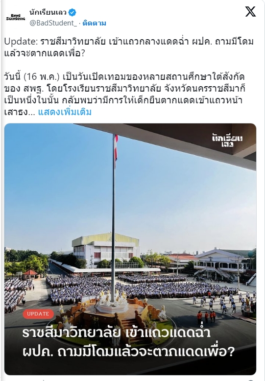“Update : ราชสีมาวิทยาลัย เข้าแถวกลางแดดฉ่ำ ผปค. ถามมีโดมแล้วจะตากแดดเพื่อ?