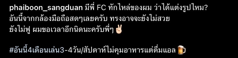 ล่าสุด ครูไพบูลย์ ก็ได้ถือโอกาสดีออกมาไขข้อข้องใจเกี่ยวกับในประเด็นนี้ ผ่านช่องทางอินสตาแกรมส่วนตัว ด้วยการโพสต์ภาพถ่ายเซลฟี่ เวอร์ชั่นกล้องสดโนฟิลเตอร์ ให้ได้ส่องความล่ำชัดๆ พร้อมกับแนบแคปชั่นทิ้งท้ายด้วยว่า “มีพี่ FC ทักไหล่ของผม ว่าได้แต่งรูปไหม? อันนี้จากกล้องมือถือสดๆ เลยครับ ทรงอาจจะยังไม่สวย ยังไม่ฟู ผมขอเวลาอีกนิดนะครับพี่ๆ #อันนี้ 4 เดือนเล่น 3-4 วัน /สัปดาห์ ไม่คุมอาหารแต่ดื่มแอล”