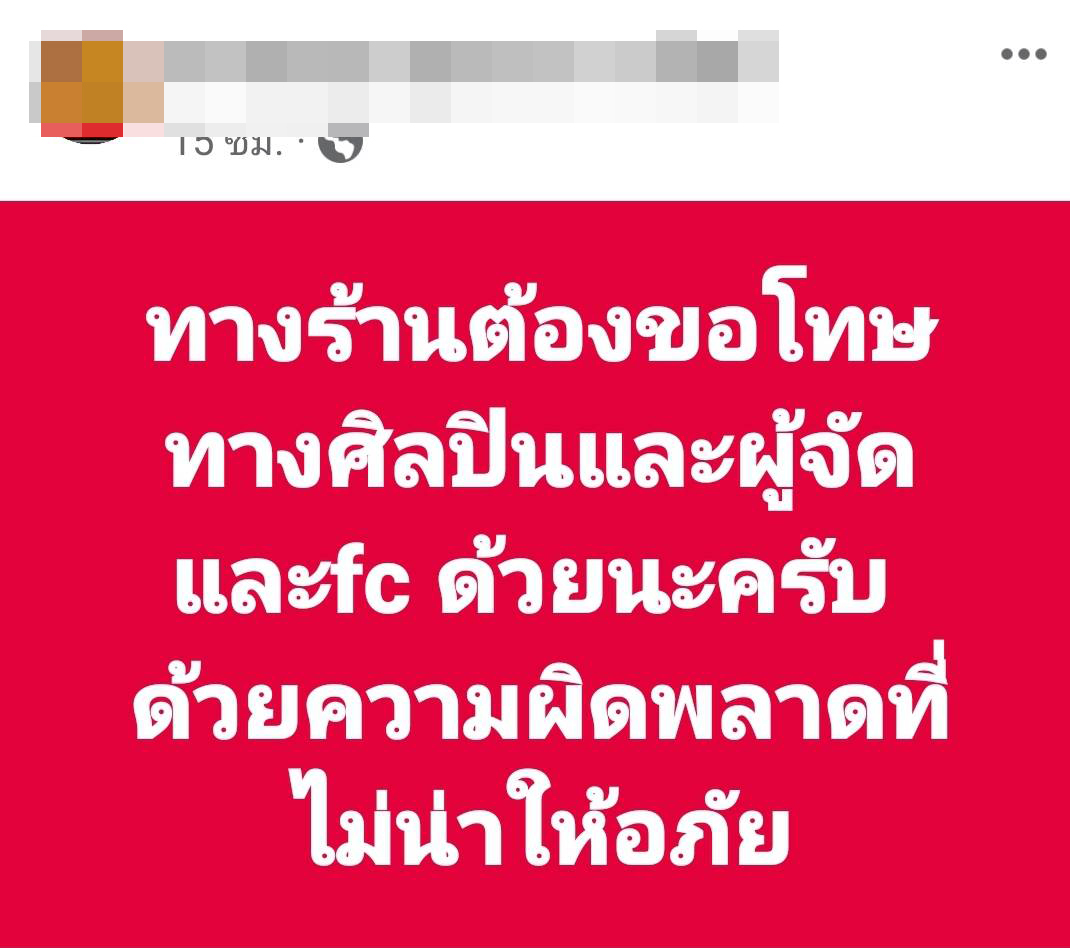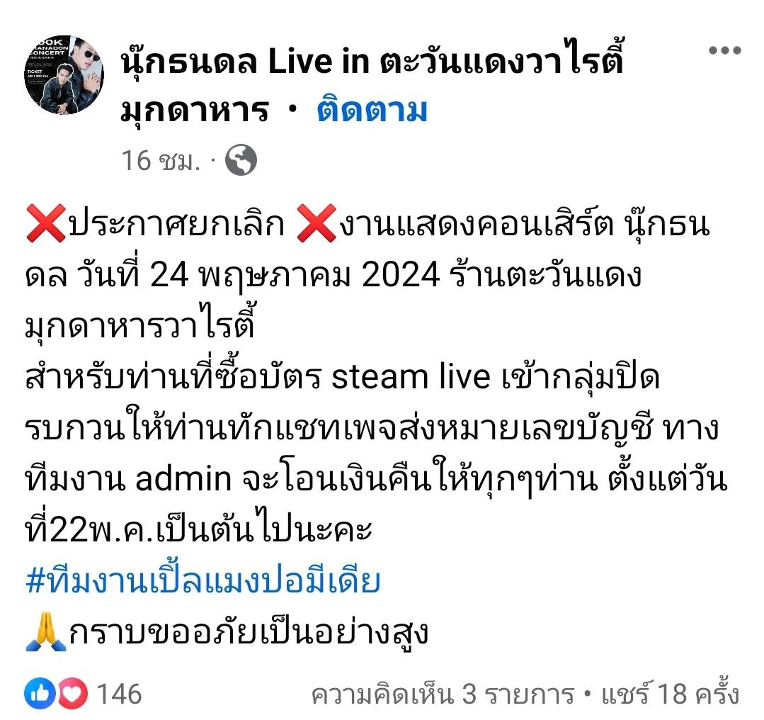 งานนี้ FC ผู้รักนุ๊ก ถึงกับเดือดหลังเห็นโพสต์และข้อความดังกล่าว ไม่แสดงความสำนึกผิด ประมาณว่า หายใจก็ยังผิด ขอโทษจะต้องสะกดยังไง ซึ่งเป็นพฤติกรรมที่ไม่เหมาะสม และแฟนคลับรับไม่ได้ถึงการกระทำดังกล่าวของร้าน ต่อมา ทางทีมงานก็ได้ออกมาประกาศยกเลิกเป็นที่เรียบร้อยแล้ว และเปลี่ยนเป็นไปจัดคอนเสิร์ตร้านจังหวัดขอนแก่นแทน และทางร้านก็ได้ออกหนังสือประกาศขอโทษเป็นที่เรียบร้อยแล้ว ด้วยใจความประมาณว่า “ทางร้านไม่มีสิ่งใดจะแก้ตัว ขอยอมรับความผิดทุกๆอย่างที่เกิดขึ้น และต้องกราบขออภัยเป็นอย่างสูงกับแฟนคลับทุกๆ ท่าน รวมทั้ง คุณนุ๊ก ธนดล มา ณ ที่นี้ด้วย หวังว่าแฟนคลับทุกๆท่าน รวมทั้ง คุณนุ๊ก ธนดล จะรับคำขอโทษจากทางร้านในครั้งนี้”
