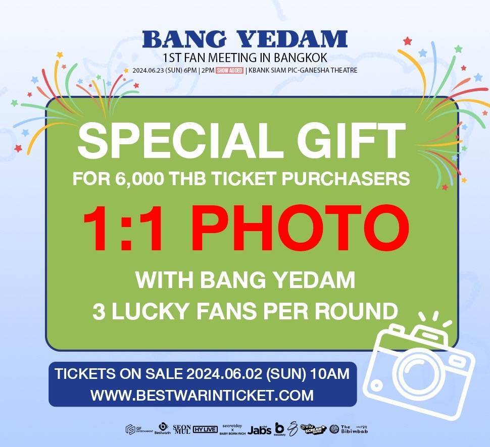 ทนกระแสตอบรับที่ดีไม่ไหว เปิดเพิ่มรอบให้ชาว “บายดี” ไทย ได้ไปหา “บัง เยดัม” กันได้ถ้วนหน้า ในรอบการแสดง งาน “BANG YEDAM” 1st Fan Meeting In Bangkok รอบเวลา 14.00 น. ในวันอาทิตย์ที่ 23 มิถุนายน 2567 พร้อมสิทธิ์พิเศษ Hi bye และของขวัญสุดพิเศษกับการลุ้นถ่ายรูป 1:1 กับบัง เยดัมแบบใกล้ชิดของทุกรอบ และเตรียมพบชมโชว์สุดพิเศษเฉพาะที่ไทยเท่านั้น