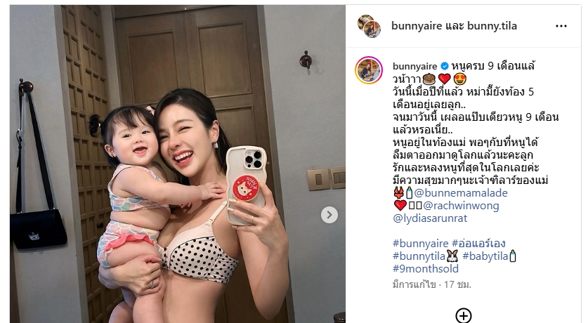 โดย แอร์ โพสต์ระบุว่า “หนูครบ 9 เดือนแล้วน้าาา วันนี้เมื่อปีที่แล้ว หม่ามี๊ยังท้อง 5 เดือนอยู่เลยลูก.. จนมาวันนี้ เผลอแป๊บเดียวหนู 9 เดือนแล้วหรอเนี่ย.. หนูอยู่ในท้องแม่ พอๆกับที่หนูได้ลืมตาออกมาดู โลกแล้วนะคะลูก รักและหลงหนูที่สุดในโลกเลยค่ะ มีความสุขมากๆนะเจ้าฑิลาร์ของแม่”