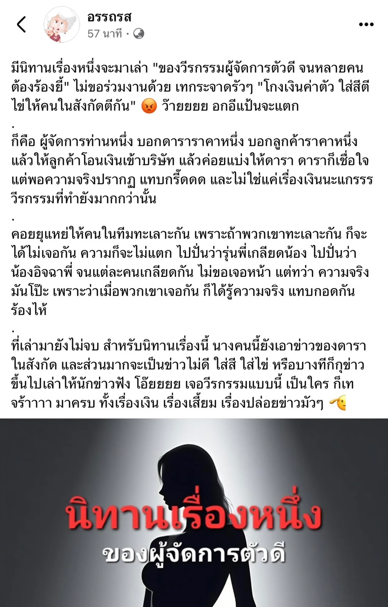 มีเรื่องมาให้ขาเผือกได้เม้าท์กันอีกแล้ว หลังเพจดังอรรถรสออกมาเล่านิทาน วีรกรรมสุดแสบของผู้จัดการดาราท่านหนึ่ง โดยระบุว่า “มีนิทานเรื่องหนึ่งจะมาเล่า “ของวีรกรรมผู้จัดการตัวดี จนหลายคนต้องร้องยี้” ไม่ขอร่วมงานด้วย เทกระจาดรัวๆ “โกงเงินค่าตัว ใส่สีตีไข่ให้คนในสังกัดตีกัน” ว๊ายยยย อกอีแป้นจะแตก