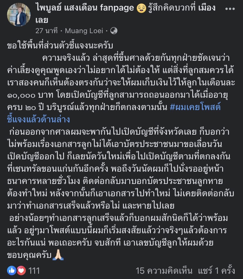 อย่างน้อยๆทำเอกสารลูกเสร็จแล้วก็บอกผมสักนิดก็ได้ว่าพร้อมแล้ว อยู่ๆมาโพสต์แบบนี้ผมก็เริ่มสงสัยแล้วว่าจริงๆแล้วต้องการอะไรกันแน่ พอเถอะครับ จบสักที เอาเลขบัญชีลูกให้ผมด้วย ขอบคุณครับ🙏🏻