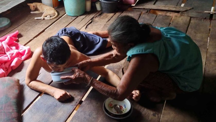 คุณยายเพ็ญ เล่าว่า ต้องคอยหุงข้าว ทำกับข้าว ป้อนข้าวป้อนน้ำให้ลูกที่พิการทั้ง 4 คน เวลาปัสสาวะหรือขับถ่ายบางครั้งก็จะพาลากไปเข้าห้องน้ำ บางครั้งจะให้ขับถ่ายลงรูของพื้นบ้านไม้ แล้วค่อยใช้ดินกลบทีหลัง ด้วยสังขารที่ร่วงโรยลงทุกวันของตน ทำให้ไม่ค่อยมีเรี่ยวแรงมากเหมือนแต่ก่อน