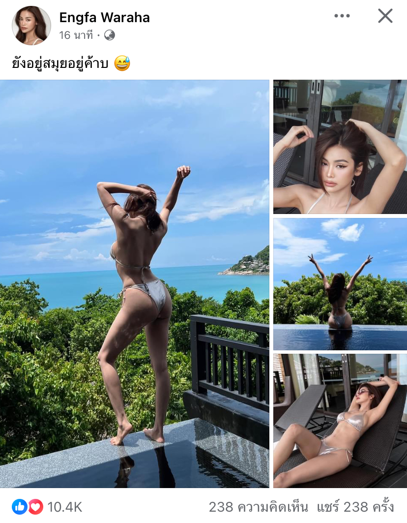 โดยล่าสุดทำเอาทะเลสมุยเดือด สาวอิงฟ้าออกมาอวดบอดี้สุดแซ่บ ที่ต้องร้องซี๊ดเลยทีเดียว กับบิกินี่ตัวจิ๋ว นอนอาบแดดประเทศไทย สู้กันไปเลยสิคะ ความร้อนแรงของแดดกับความร้อนแรงของอิงฟ้า ใครจะแรงกว่ากัน