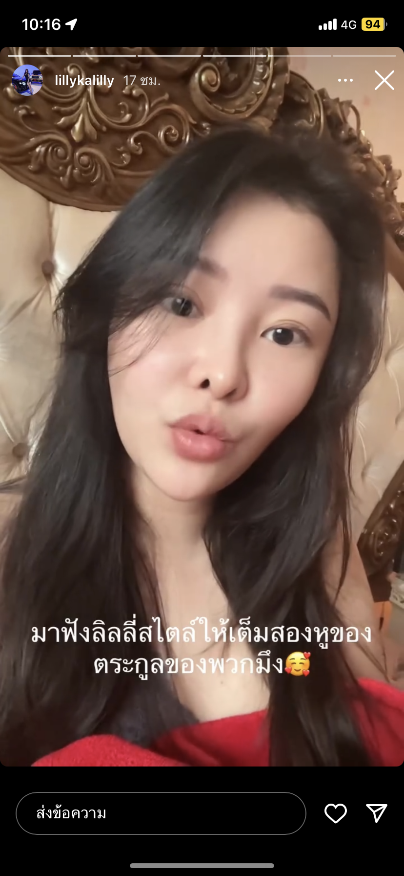 ถ้าหากอยากฟ้องก็มาเจอกันในรายการโหนกระแส หรือรายการคนดังนั่งเคลียร์ก็ได้ พูดความจริงต่อหน้าตน เคลียร์ชัดๆ ให้ประชาชนได้รู้ ถ้ามึงยอม จะยอมตกนรกให้ตระกูลพวกมึง แต่ถ้าตอแหล เด็กอย่างกูจะเป็นแมงเม่าบินเข้ากองไปให้พวกมึงเชือด สะใจพวกมึงไปเลย ขอโทษนะ ลิลลี่สไตล์ยึดหลักความถูกต้อง พยายามเป็นคนดี แต่ถ้ากูเลวจะกระชากมึงลงนรก แล้วเจอกัน