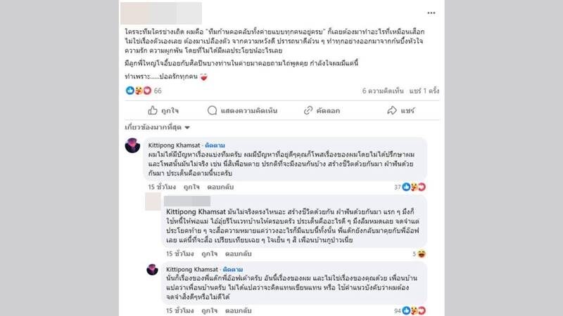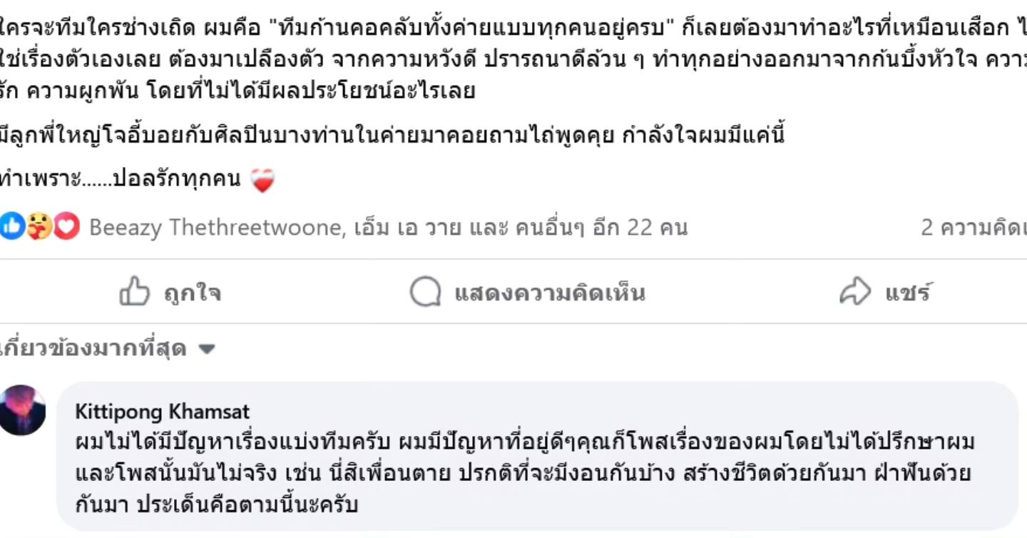 ในขณะที่ โก๋เอ็ม ก็ได้เข้ามาคอมเมนต์ว่า “ผมไม่ได้มีปัญหาเรื่องแบ่งทีมครับ ผมมีปัญหาที่อยู่ดีๆ คุณก็โพสต์เรื่องของผมโดยไม่ได้ปรึกษาผม และโพสต์นั้นมันไม่จริง เช่น นี่สิเพื่อนตาย ปกติที่จะมีงอนกันบ้าง สร้างชีวิตด้วยกันมา ฝ่าฟันด้วยกันมา ประเด็นคือตามนี้นะครับ”