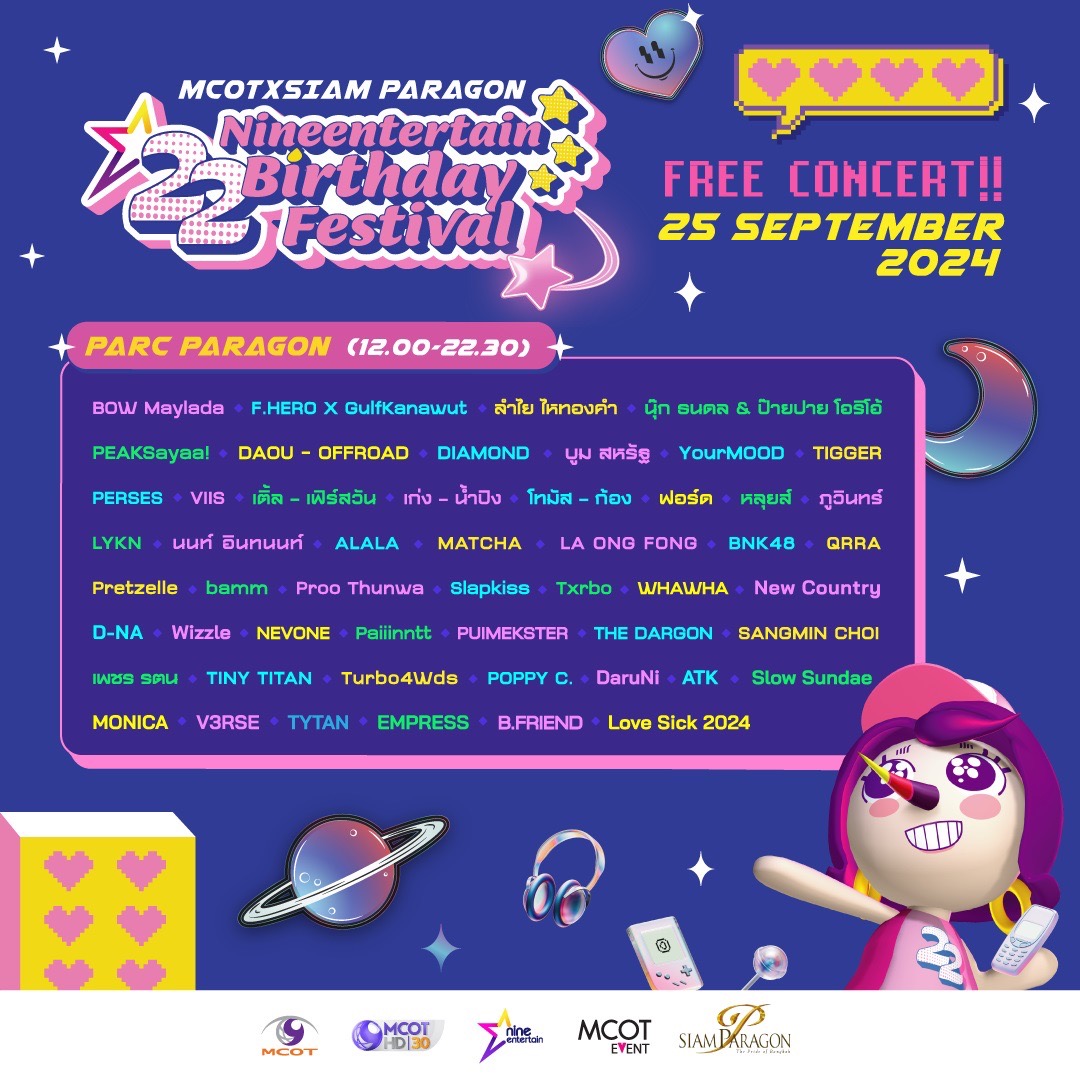 บริษัท อสมท จำกัด (มหาชน) ร่วมกับ ศูนย์การค้าสยามพารากอน ฉลองครบรอบ 22 ปี รายการไนน์เอ็นเตอร์เทน ซึ่งออกอากาศทางช่อง 9 กด 30 จัดฟรีคอนเสิร์ตแบบมาราธอน รันยาวกว่า 9 ชั่วโมงเต็มกับ “MCOTxSIAM PARAGON present NINEENTERTAIN BIRTHDAY FESTIVAL 2024” ในวันพุธที่ 25 กันยายนนี้ ตั้งแต่เวลา 12.00-22.00 น. ณ พาร์คพารากอน ชั้น M ศูนย์การค้าสยามพารากอน