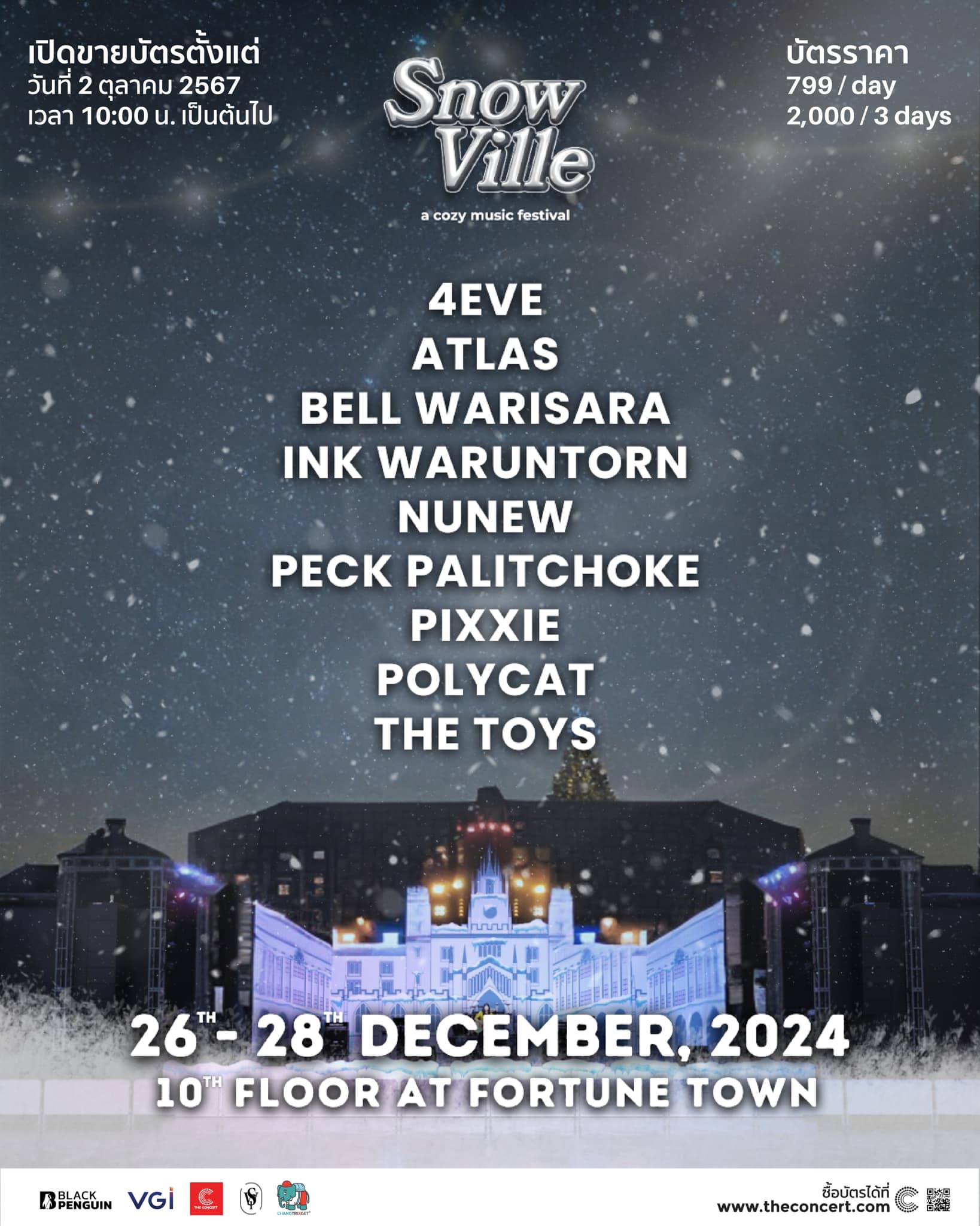 พร้อมจัดเต็มความสุข!! ส่งท้ายความสนุกช่วงปลายปี กับ “Snow Ville Festival” เทศกาลดนตรีในหมู่บ้านหิมะครั้งแรกกลางกรุงเทพ! พร้อมยกทัพ 9 ศิลปินสุดฮอตแถวหน้าของเมืองไทย อย่าง 4EVE, PiXXiE, Bell Warisara, Ink Waruntorn, Nunew, The Toys, Polycat, ATLAS และ Peck Palitchoke ให้แฟนๆ ได้เอ็นจอยแบบใกล้ชิดกับศิลปินคนโปรดในบรรยากาศหมู่บ้านหิมะที่ได้รับแรงบันดาลใจมาจากตลาดคริสต์มาสในยุโรป โดยจะจัดขึ้นในวันที่ 26-28 ธันวาคม 2567 ณ. ศูนย์การค้าฟอร์จูนทาวน์ ชั้น10 จัดเต็มความสนุกให้ฟินกันแบบจุกๆ 3วัน 3คืน พร้อมกิจกรรมสุดเอ็กซ์คลูซีฟอีกเพียบ!