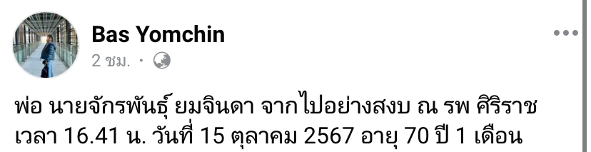ก็ต้องบอกได้เลยว่าเมื่อวันที่ 15 ตุลาคม 2567 เฟซบุ๊ก Bas Yomchin เป็น Facebook ของลูกสาว โพสต์ภาพของ “นายจักรพันธุ์ ยมจินดา” พร้อมแคปชั่นประกอบว่า “พ่อ นายจักรพันธุ์ ยมจินดา จากไปอย่างสงบ ณ รพ ศิริราชเวลา 16.41 น. วันที่ 15 ตุลาคม 2567 อายุ 70ปี 1 เดือน“