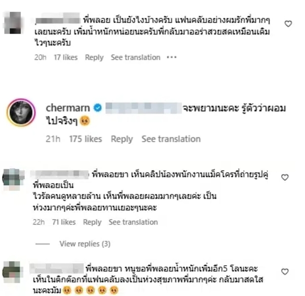 ล่าสุด พลอย เฌอมาลย์ โพสต์ภาพขณะไปร่วมงานคอนเสิร์ต Rollingloud Thailand สวยแซ่บเหมือนเดิม แต่รูปร่างก็ยังดูผอมกว่าเดิมมากจริง ๆ ด้านแฟนคลับทั้งชายและหญิงต่างก็เข้ามาแสดงความคิดเห็นใต้โพสต์ดังกล่าวกันยกใหญ่ ซึ่งทุกคนต่างก็แสดงความเป็นห่วงนักแสดงสาวตัวแม่กันหมด กระทั่งเจ้าตัวตัดสินใจตอบกลับคอมเมนต์หนึ่ง โดยเธอยอมรับว่าตัวเองผอมเกินไปจริง ๆ และจะพยายามเพิ่มน้ำหนักขึ้นมา