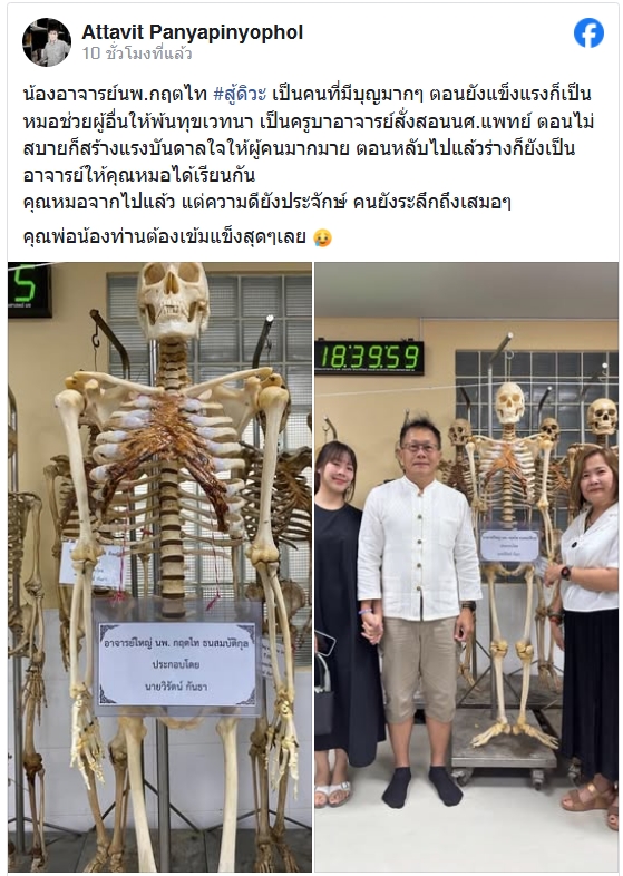 ล่าสุดเจ้าของเฟซบุ๊ก Attavit Panyapinyophol ได้เผยแพร่ภาพโครงกระดูกอาจารย์ใหญ่ พร้อมข้อความว่า “น้องอาจารย์นพ.กฤตไท #สู้ดิวะ เป็นคนที่มีบุญมากๆ ตอนยังแข็งแรงก็เป็นหมอช่วยผู้อื่นให้พ้นทุขเวทนา เป็นครูบาอาจารย์สั่งสอน นศ.แพทย์