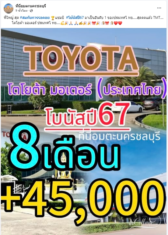 เมื่อเพจ ที่นี่อมตะนครชลบุรี ออกมาโพสต์ว่า โตโยต้า ใจป้ำแจกโบนัส ประจำปี 2567 ให้จุกๆ 8 เดือน พร้อมเงินอีก 45,000 บาท